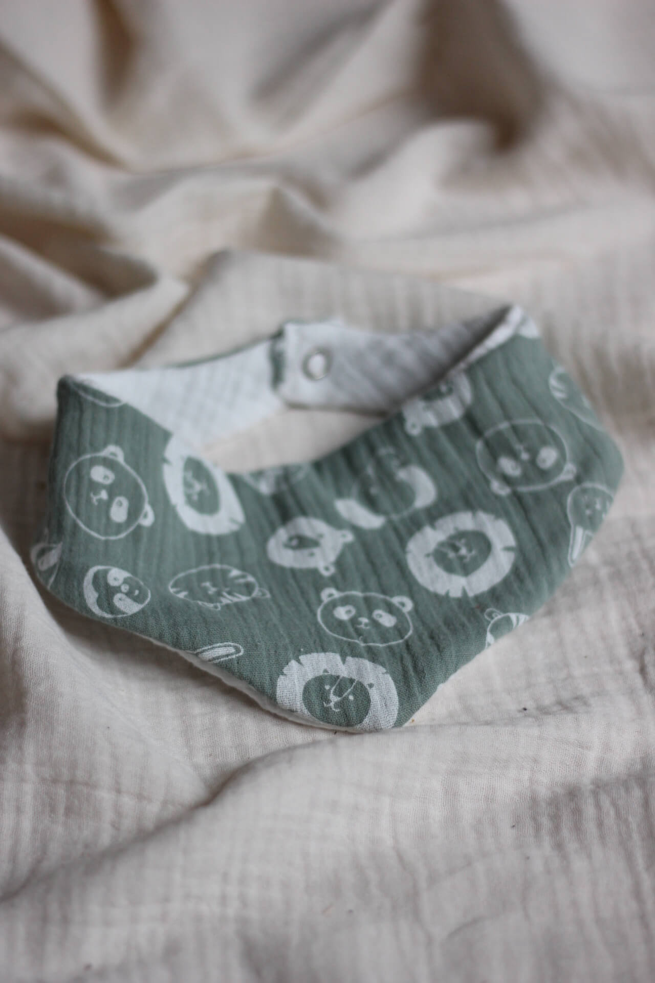 Praktisch: da es ein Wendehalstuch ist, können beide Seiten getragen werden, immer passend zum Outfit. Eine Musselinstoff-Seite in unserem “Tierkarussell Ultra Cool”, die andere Seite in einem reinen weiß.